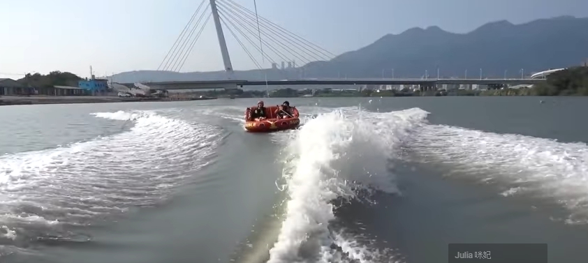 挑戰完寬板滑水之後,咪妃接著要嘗試快艇衝浪,快艇衝浪與寬板滑水皆是利用快艇的尾浪奔馳在水面上,唯一不同處就在於快艇衝浪的腳不會固定於衝浪板上,所以重心的調整以及各種花式靈活度更高更自由。咪妃第一次滑行也是經歷幾十次的失敗才得以完美站立。
