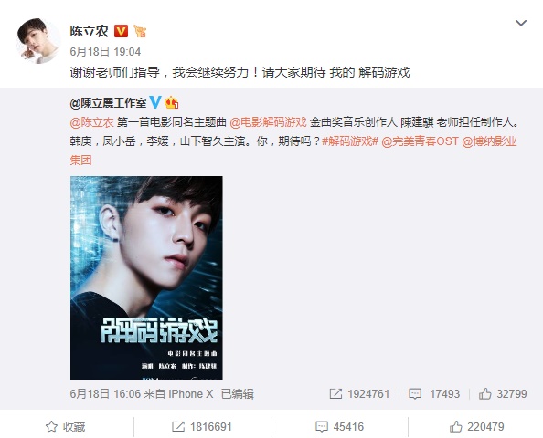 18日時陳立農透過微博發文表示「謝謝老師的指導,大家期待我的第一首電影主題曲『解碼遊戲』!」且該主題曲找來知名音樂人陳建騏製作,相當大製作。電影『解碼遊戲』由安德魯·摩根,陳熙瑢監製,李海龍執導,韓庚,鳳小岳,李媛,山下智久主演,影片講述了一個逗比宅男極客的成長歷險故事。其中,山下智久首次到中國拍片就和韓庚搭檔演出,引發網友熱烈討論。電影製作團隊相當用心,不僅在上海、香港、 馬來西亞、吉隆坡等亞洲地區拍攝外,更遠赴英國倫敦等地取景拍攝。