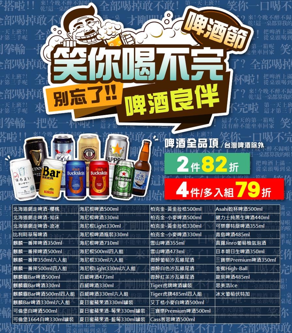內容:進口啤酒3件79折、6件77折。如:日本真露JINRO系列、KIRIN冰結旅途調酒、日本三得利微醉系列......等13件啤酒商品。
