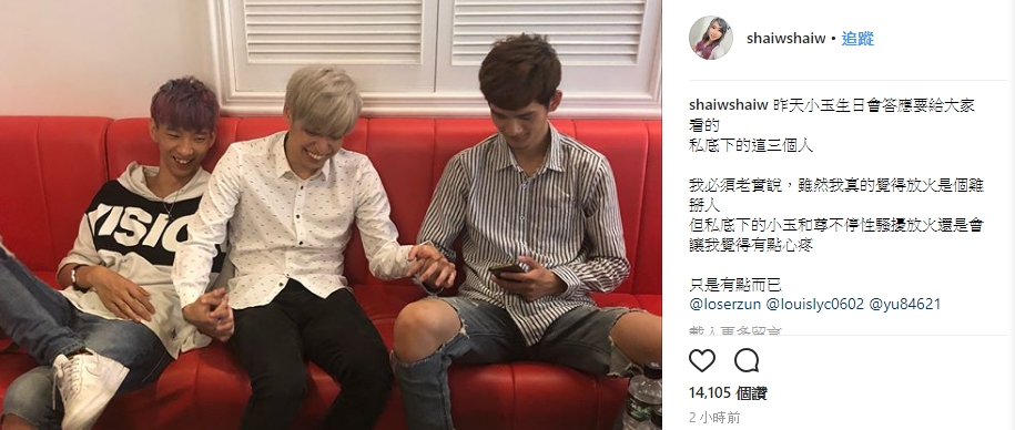 笑笑24日在IG發佈小玉、放火和尊的私底下互動,她在IG表示:「答應要給大家看的,私底下的這三個人」,並附上一小段影片跟照片,可以看到小玉、放火和尊牽起彼此的手,牽起手就算了,小玉還默默將手往放火的大腿內側摸,讓放火感到害羞,笑笑還補充說,「我必須老實說,雖然我真的覺得放火是個雞掰人,但私底下的小玉和尊不停性騷擾放火,還是會讓我覺得有點心疼!」不過,笑笑又強調「只是一點而已」,相當逗趣!