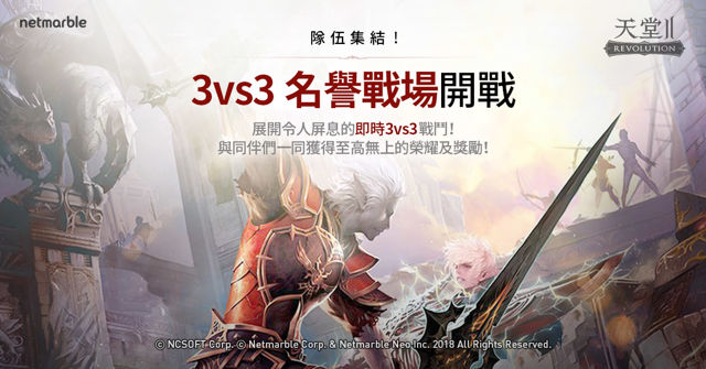 手機遊戲公司(Netmarble Corporation)近日宣布MMORPG《天堂 2:革命》慶祝一週年,並為遊戲帶來重大更新,更強勢推出全新「3vs3 名譽戰場」,讓玩家攜伴共同體驗廝殺快感 !