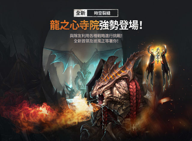 新的時空裂縫副本「龍之心寺院」於本次更新後同步推出。「龍之心寺院」將出現龍族特性的怪物,玩家將可以透過先前推出的龍族特性裝備更輕鬆的通關,且將能獲得全新的「覺醒的安伯力恩披風」為獎勵。