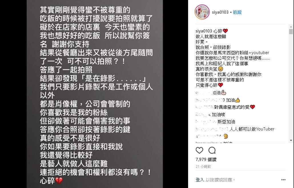 25日,斯亞私下出門吃飯時遇見粉絲要合照,礙於並沒有多加裝扮也還在用餐中,再加上臉滿素的,主動提議說要以簽名代替,同時感謝著粉絲的支持。怎料用餐完步出餐廳時,發現又被同一人尾隨問合照,答應之後才發現「是在錄影…」但其實在糖果的公司規定之下,如果是影片錄製除非工作或個人拍攝,都是有肖像權的,這個舉動也讓她感到相當無奈:「你喜歡我,是我的粉絲,但卻做著可能會傷害我的事,答應你合照卻按著錄影的鍵,真的感受不是很好。」