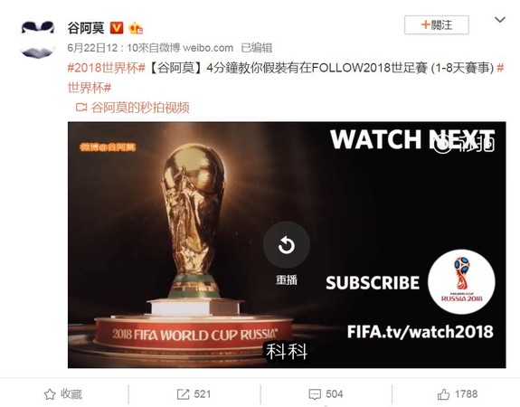 這次又惹上狠角色,日前谷阿莫就推出「4分鐘教你假裝有在發落2018世足賽 (1-8天賽事)」,其中用到了世足的畫面,而愛爾達花2億元台幣買下世足賽在台灣的獨家播映權,也讓「愛爾達體育家族」的小編在22日網路上轉貼谷阿莫影片警告「希望您一切安好」,讓谷阿莫在臉書上先移除了影片之後28日也上傳「正版兩分鐘,帶你看韓德站最後發生啥事,看來有人繼續捍衛二創權,FIFA準備去函,小編祝保安」