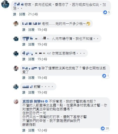 該照片一貼出後,卻引來網友的大肆批評:「悲哀,賣肉還迎笑,委屈你了,因為現實上會如此」、「除了這樣就沒其他技能了?看多也開始沒感覺了」面對網友的侮辱,雪碧冷靜回:「不好意思,我的才藝就是肉販?不懂的人都覺得女生露一點,在賣弄身材就是沒才藝,你知道我們真正辛苦的點在哪邊嗎?」,甚至怒嗆這群鍵盤俠「只出一張嘴的打打字,還剩下什麼才藝,不懂我們辛苦,就不要隨便評論我們,謝謝指教。」隨後也截圖這些網友的回應,並發文:「不多說,別侮辱我就好!」
