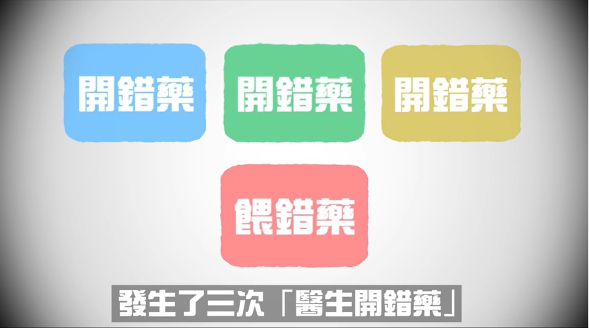 經過九個月的治療,歷經開刀、放射線治療、化學治療到現在的安寧治療。但其中卻發生醫生三次開錯藥,而還有一次在住院時,護理師還餵錯藥。第一次是發生在放射性治療時,醫生少開了要,第二次是藥的劑量給少了,而第三次拿藥回家發現,藥還是給錯。跟醫院反應,醫生居然只回覆:「你沒說你要開阿」、「啊我開錯了」,讓人非常傻眼。而三次失誤,都是由媽媽主動發現,去跟醫院反應的。