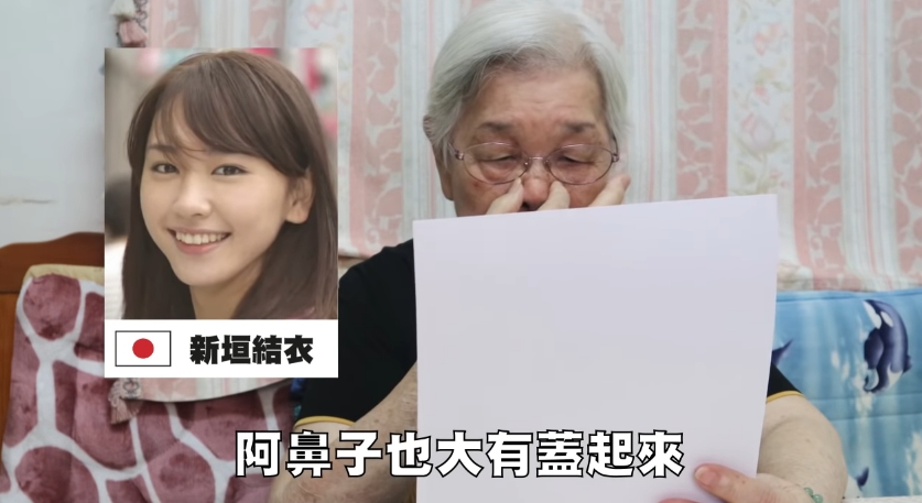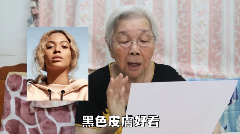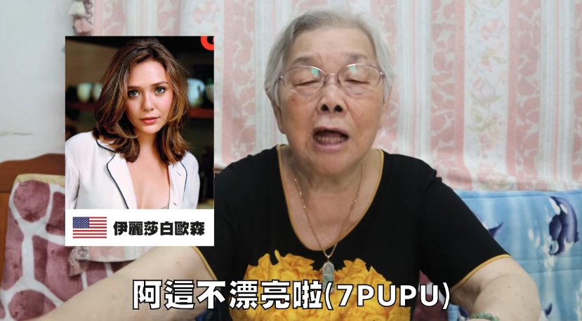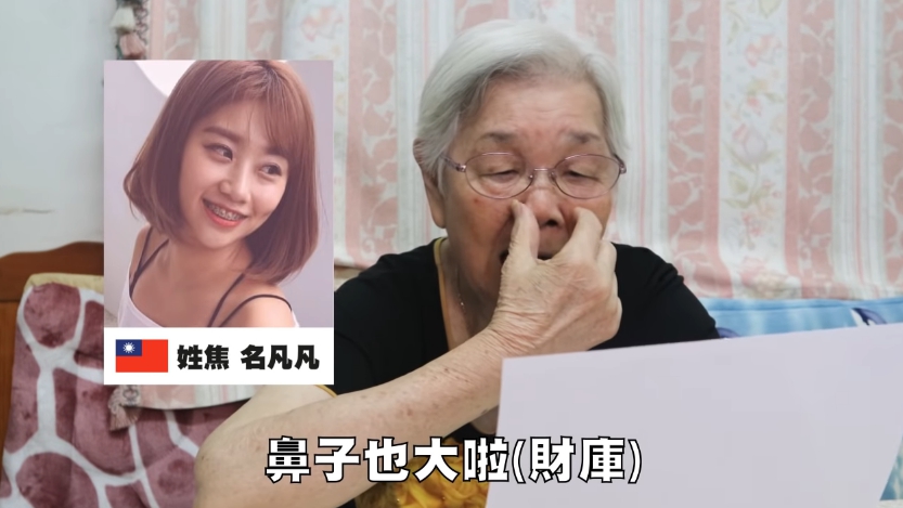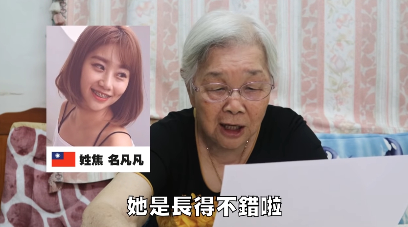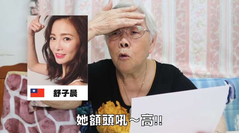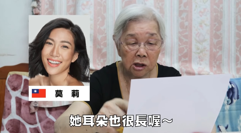 第一位新垣結衣,「耳朵大,有福氣,鼻子也大有蓋起來」,並自嘲:「像我這樣鼻空開開不好」;第二位碧昂絲,「黑色皮膚好看,但下巴太長」;第三位伊麗莎白歐森,阿嬤直接地說,「這個不好看,傲嘟嘟,臉沒有笑容」,並把照片往旁邊一扔;第四位舒子晨,「討老婆這個額頭要高。」