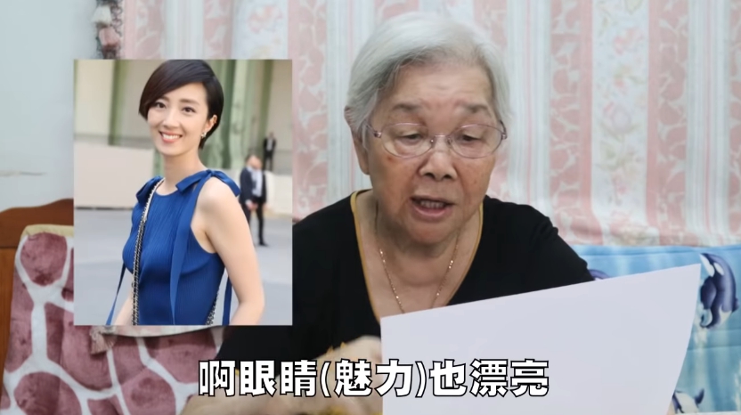 第五位焦凡凡,阿嬤不僅對凡凡的姓氏很有興趣,對長相也讚不絕口,「她是長得很不錯啦,鼻子也大啦,有財庫」,焦凡凡的地位整個大勝「緋紅女巫」伊麗莎白歐森;第六位桂綸鎂,「眼睛很漂亮、耳朵又長」;第七位是名國際模特兒莫莉,「她耳朵也很長喔,雙眼皮」;最後一位鄧麗君,「這有漂亮,臉圓潤。」