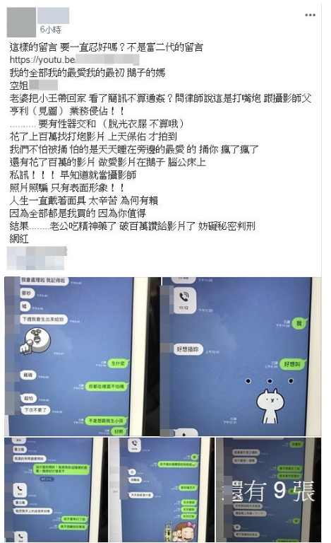 2017年底因工作需求認識H先生,長年累積的無愛婚姻,讓我頓時犯了錯,不是因為他條件比我老公好而愛上對方,只是有個人陪而已,2018年老公在家中裝了監視器我完全不知情,對於這件錯誤我於事發後不斷的向我老公認錯道歉,希望能挽回婚姻及家庭,也完全斷絕與H先生的聯絡,然自此以後我的日子卻因為他不斷的威脅逼迫我,而陷入痛苦深淵,他不但對我提出刑事妨害家庭告訴,還不斷逼迫我給他大筆金錢,否則他要用盡各種方法毀掉我,甚至跟我玉石俱焚,今日他將此事情曝光,我必須再次向大眾道歉。
