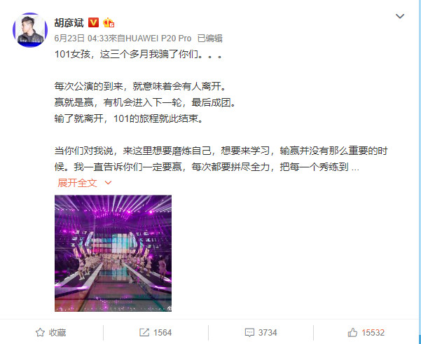 而導師胡彥斌也在總決賽當日在微博寫下要給《創造101》女孩們的真心話,開頭寫著「這3個多月我騙了你們...」引發網友熱議。他解釋,在比賽期間他一直告訴女孩們一個人生命中的機遇不會一直都有,因此當機會來臨,希望能不給自己留任何後路、不給自己找任何藉口,投入百分之百的努力及熱情,「哪怕擠掉睡覺的時間,也要把台上那幾分鐘做好。」希望女孩們不要錯過任何的機會,積極的投入,但其實「輸贏其實沒有那麼重要,經歷才是人生中最寶貴的禮物」。