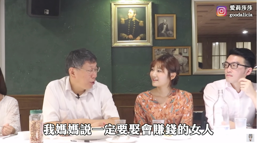 愛莉莎莎不放棄的追問「喜歡老婆哪一點?」,柯P先是秒達「吃苦、耐勞」後,又一一補充「她會賺錢,而且賺得比我多」,「我媽媽說一定要娶會賺錢的女人」,個性太難伺候「有公主病的受不了」。