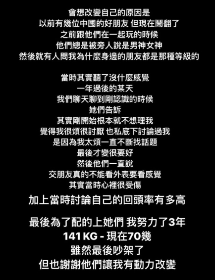 而當初為了"配得上"身邊的那群好友,該名網友下定決心,努力了三年,進而成功轉變了形象,蛻變成現在的模樣,雖最後已與那些友人吵架決裂,但原po仍維持正面心態,感謝他們讓自己有動力改變。