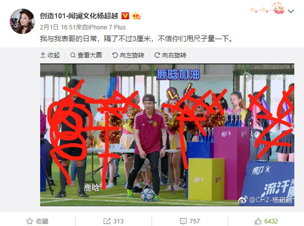 近日,她在出道前錄製綜藝節目《約吧!大明星》的畫面被網友翻出,畫面中節目固定班底當紅男星鹿晗在場上踢足球,場邊的其中一位綁著馬尾的女孩就是楊超越。當年身為迷妹的她因為與鹿晗兩人同屬大眼睛、巴掌臉,所以有網友笑稱兩人像是失散的兄妹,她也開玩笑地寫下誓言「過幾年我一定要和我表哥鹿晗相認」。