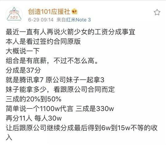 該網友指出:火箭少女組合是有底薪,其中分成是3:7,成員拿3,騰訊拿7,其中成員的經紀公司便跟成員共分3,而成員們能夠拿多少,就得看跟原公司所簽訂的合同而定,裡面初估評算是3成中的20%到50%。網友舉例,一個代言假設收入1100萬人民幣(幣值下同),3成是330萬,團體有11人,每一個團員的經紀公司大約拿到30萬,最終成員從經紀公司領到的酬勞大約是6萬到15萬不等,那其實這樣算下來,成員們收入都不太高。