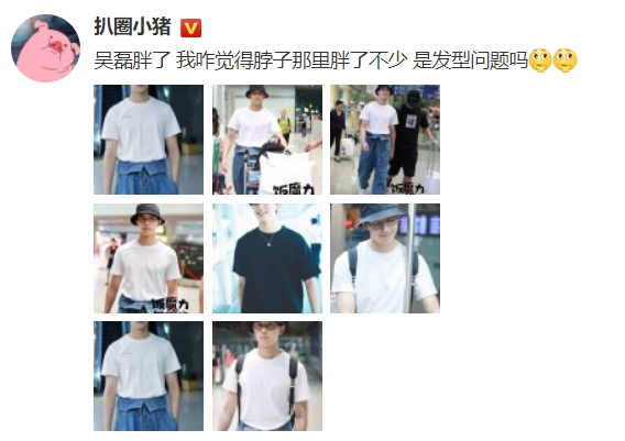 照片中,吳磊戴著黑色漁夫帽,配戴金屬圓框眼鏡,身著白色素T以及水洗牛仔寬褲,一派輕鬆地走在機場大廳,行走間都露出男人的大方以及自信感,眼神也是時不時的放電。雖然俊俏臉龐依舊不變,但仍然有許多網友發現體型似乎變大了好幾倍,為此「吳磊胖了」這幾個關鍵字還上了微博的熱搜榜,網上留言此起彼落,引發不小轟動,還有人一時不能接受崩潰地說:「怎麼胖成這樣!」但也有不少人認為吳磊應該只是練壯了,並笑稱:就算胖了也還是一樣好看,畢竟顏值放在那兒呢!更有不少粉絲護航說:只是角度、水腫問題!同時也心疼太瘦也不好看,現在這樣剛剛好!