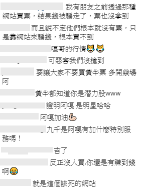 網友看到紛紛留言:「可惡害我們沒搶到」、「要讓大家不要買黃牛票 多開幾場阿」、「黃牛都知道你是潛力股」、「證明阿嘎是明星」、「就是這個該死的網站」有網友看到時也氣憤表示自己的朋友曾經被騙錢,票也沒拿到,其實黃牛又貴又沒保障,還是希望大家不要買黃牛才好!