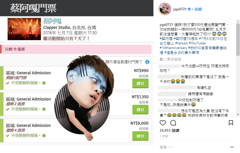 昨(1)日蔡阿嘎在自己的IG打上:「傻眼!!我才賣500元還送展覽門票,你給我飆到一張9000元?給鬼買啊? 」。原來阿嘎的這場「十周年夏日演唱會」一張僅售價500元,而在黃牛的市場中價錢卻十分驚人,賣到$990和$1350不等,更有賣家直接提高價碼至$9000,非常誇張,蔡阿嘎也直呼:「五月天都沒這麼貴,太看得起我了吧!!!! 」對於黃牛相當無奈。因為這個網站是國外的網站,並且在國外為合法,阿嘎似乎也束手無策。