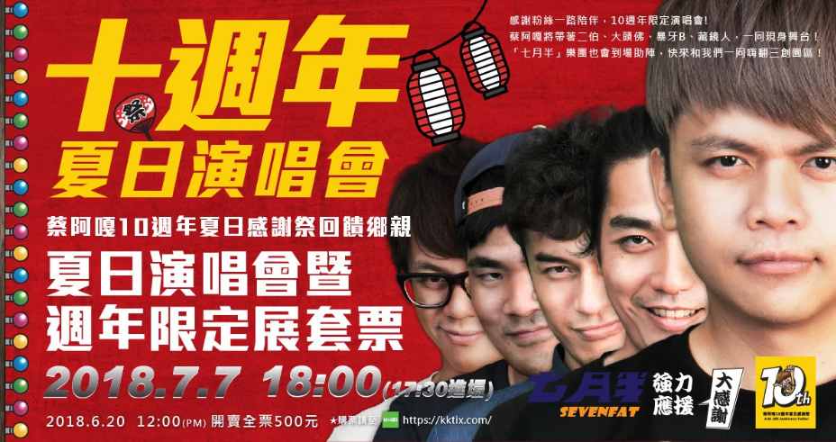 2008年發布第一支影片的蔡阿嘎,至今已經是他出道10年,為了紀念這個歷史性的一刻,蔡阿嘎砸了好幾百萬舉辦「蔡阿嘎十週年感謝祭特展」,除了展覽之外,也舉辦了一場「十周年夏日演唱會」,除了蔡阿嘎本人之外,還會有二伯、大頭佛、暴牙B,以及許久不見的藏鏡人,一同現身舞台!「七月半」樂團,馬叔叔 UNCLE MA、蔡阿嘎、HowFun、蔡哥、廉傑克曼等人也全都會到場助陣,而門票在6月20日開賣當天秒殺,粉絲一票難求。