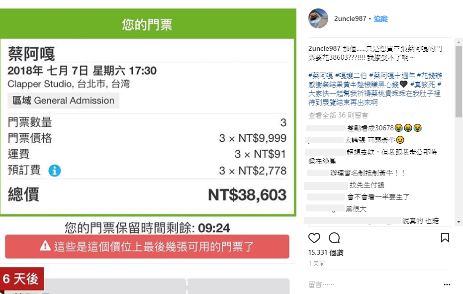阿嘎的嬌妻二伯也發文:「那個......只是想買三張蔡阿嘎的門票要花38603???!!!! 我接受不了啊~」原來是現在一張票已經高達$9999,幾乎要破萬,而二伯選購三張再加上預訂費,票價便高達三萬八千元,完全是天價!二伯也hashtag「花錢辦感謝祭結果黃牛趁機賺黑心錢,真該死」感覺相當不悅,但也只能說阿嘎的人氣真的太高了!
