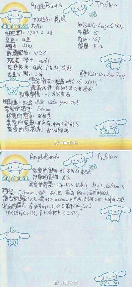 上面寫著:,喜歡的歌手陳冠希、周杰倫,喜歡的演員是張柏芝,喜歡、不喜歡吃的食物,還有連擇友條件都寫上來了!她的願望是:開開心心、自由、萬人迷、富翁!內容以上的願望她貌似都做到了,15歲的angelababy居然就167了!不愧是angelababy啊!很多網友都說:為什麼別人寫的夢想都能實現啊!或是別人的夢想從來沒讓我失望過、但也有暖心的網友說:很可愛啊,十五歲時的夢想都實現了,挺好的。