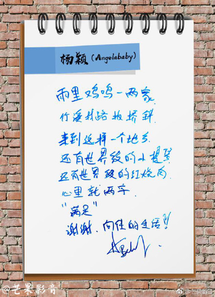 《嚮往的生活》節目組公開了「Angelababy」的字跡曝光。她寫道“雨裏雞鳴一兩家,竹溪村路板橋斜,來到這樣一個地方,還有世界級的小提琴,還有世界級的紅燒肉,心裡就兩字:滿足”歪歪斜斜的字跡好似兒童塗鴉,很是可愛。