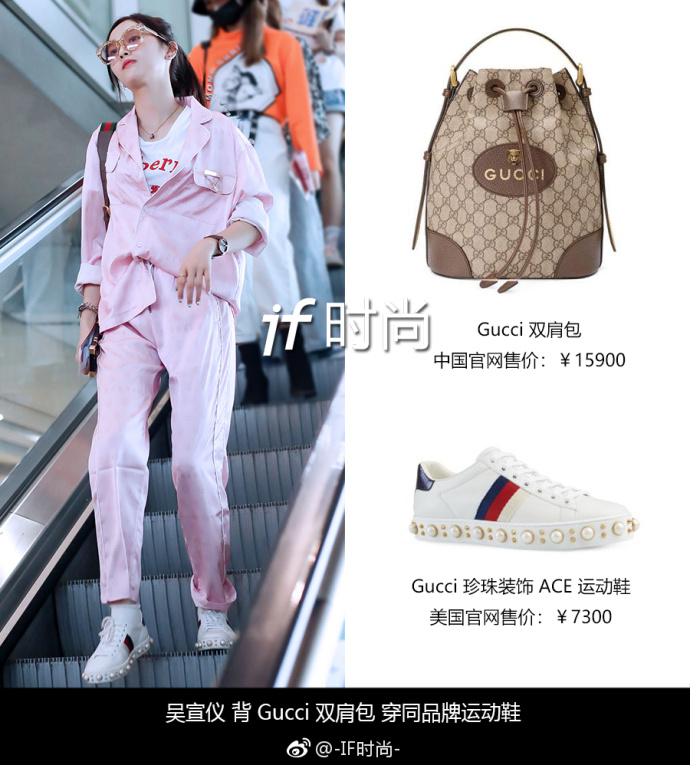 吳宣儀背的Gucci包與Gucci運動球鞋 總計折合台幣約 116000元 圖片來源/微博