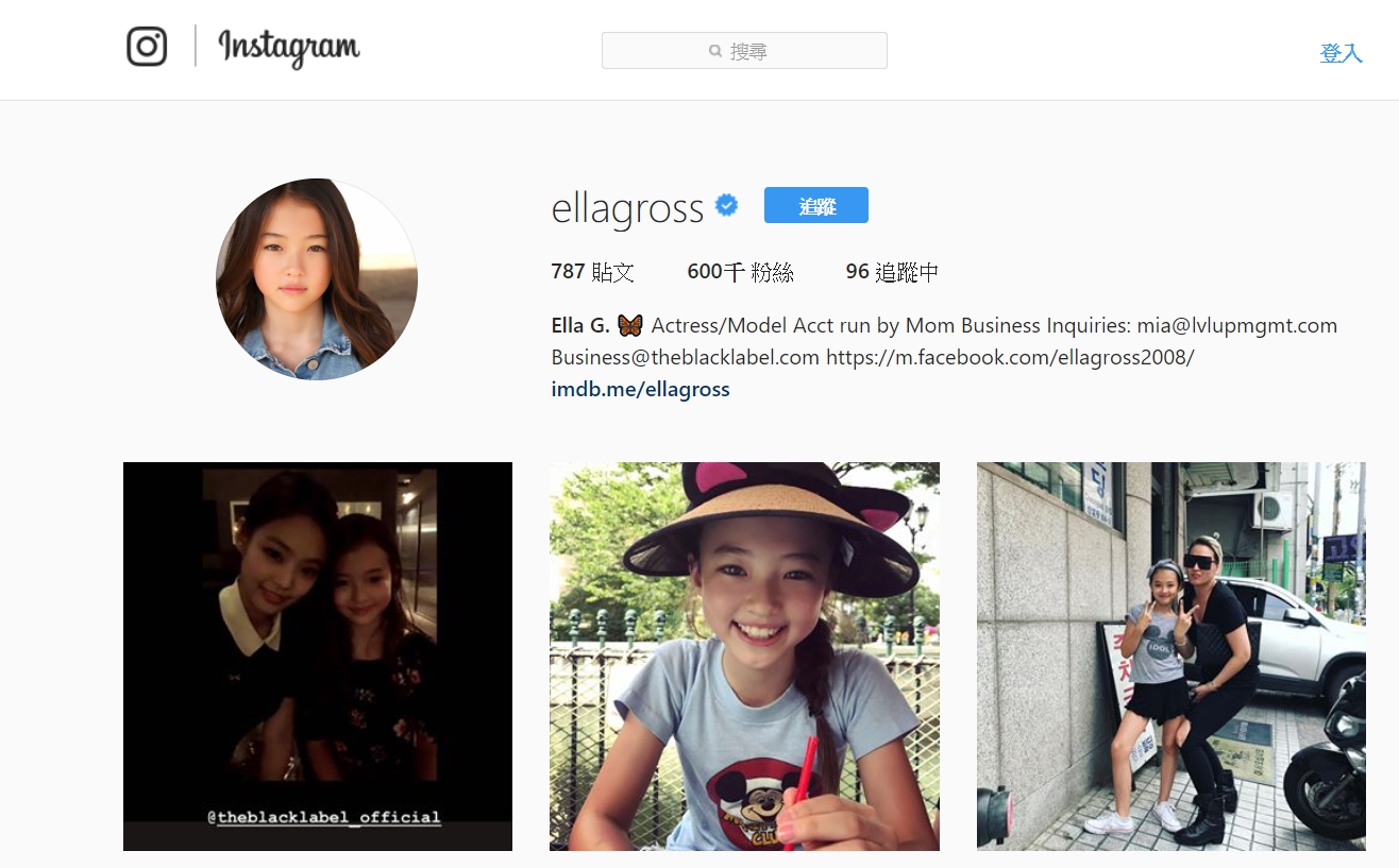 Ella Gross經營的Instagram帳號有高達近60萬人追蹤,火紅程度不輸已出道的藝人,最近正式和YG娛樂的旗下品牌簽約,並在IG放上和當紅女團BLACKPINK成員Jennie的合照,兩個人頭靠頭,同樣都擁有巴掌臉的兩人,對著鏡頭露出甜美笑容,有人說:這根本就是縮小版的Jennie吧!而照片裡Ella Gross泰若自然的神情更加讓人期待她未來的演藝表現。