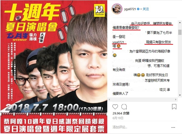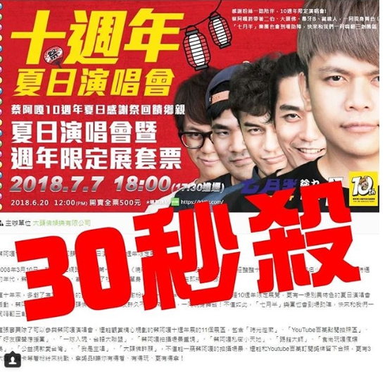 知名Youtuber蔡阿嘎可說是台灣網紅圈元老級的人物,從10年前便開始經營Youtube頻道,上傳具有濃濃本土味的搞笑視頻和地道台語教學影日片,吸引眾多粉絲,目前擁有高達170多萬訂閱人數。近年來蔡阿嘎的事業發展越來越多元化,今年7月7日將舉辦一場「時周年夏日演場會」慰勞粉絲,演唱會門票在30秒內便被搶購一空。有網友開玩笑地留言問「朋友要自己帶還是現場會發」,釣出蔡阿嘎本人霸氣回應「現場只發女朋友!」