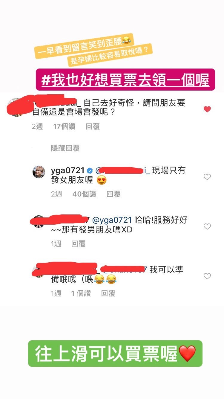 與蔡阿嘎結婚兩年多的老婆二伯今日在IG現時動態發文,說自己被網友的搞怪留言笑歪了腰。一名網友在蔡阿嘎的IG動態下留言問「請問朋友要自備還是現場會發呢?」沒想到得到蔡阿嘎本人霸氣回應:「現場只有發女朋友」令其他粉絲大讚演唱會「服務真好」