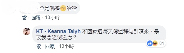 得知謝和弦終於要回家了,昨(4)日Keanna便在臉書上PO文「炫耀」自己馭夫有方,讓網友們看了直呼「太霸氣了!」Keanna自己也開玩笑說:「沒有人能在獅子座的統治下,超過9天不回家」也有網友也注意到平時形象酷帥的謝和弦,傳給老婆的自拍照竟然全是可愛的賣萌嘟嘴照,Keanna也幽默的回應「不回家還每天傳勾引照來,是要我念經消淫念嗎?」
