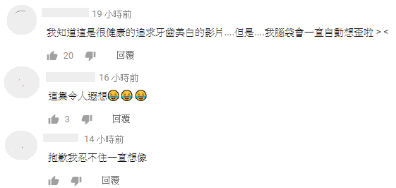 不過這個舔保養液的步驟卻引人遐想,讓網友超崩潰,網友也害羞留言:「我知道這是很健康的追求牙齒美白的影片....但是....我腦袋會一直自動想歪啦」、「這集令人遐想」、「抱歉我忍不住一直想像」。
