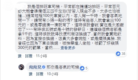 雖然有不少惡質司機,但也有同樣身為計程車司機的網友留言分享自己的工作態度,說道「我平常都會準備三四千塊的百元鈔」,問客人有沒有零錢時會盡量客氣,遇上大鈔找不開的情況也是自己去便利商店買飲料換零錢,被宛宛兒稱讚「是客氣的司機」