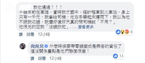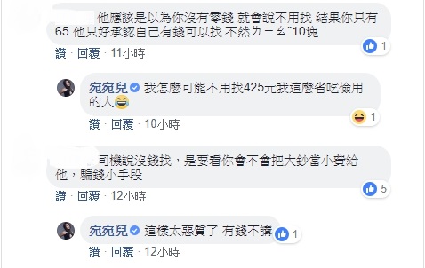 留言串中網友們也積極分享自己遇上惡質司機的經驗,有許多司機也是拒絕找零而且態度惡劣,令他們出遊的心情都被破壞,也有網友認為這根本是司機貪小便宜的手段,遇到趕時間的乘客常會直接說「不用找了」,將多餘的錢直接當小費給,宛宛兒則幽默回覆「我這麼省吃儉用,怎麼可能不要425!」