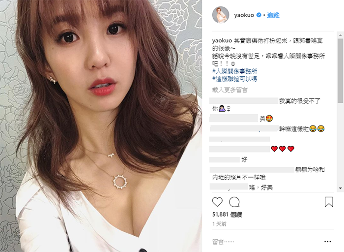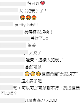 而她超犯規的照片也讓粉絲暴動打上:「可以可以可以到不行,美成這樣可以嗎?」、「很可以」、「太(犯規)了!」、「美美的」、「美得好犯規唷!」、「會不會太美了」、「當然可以」、「美炸了」,也有網友cue瑤瑤現在的男友以綸:「以綸會森77」。