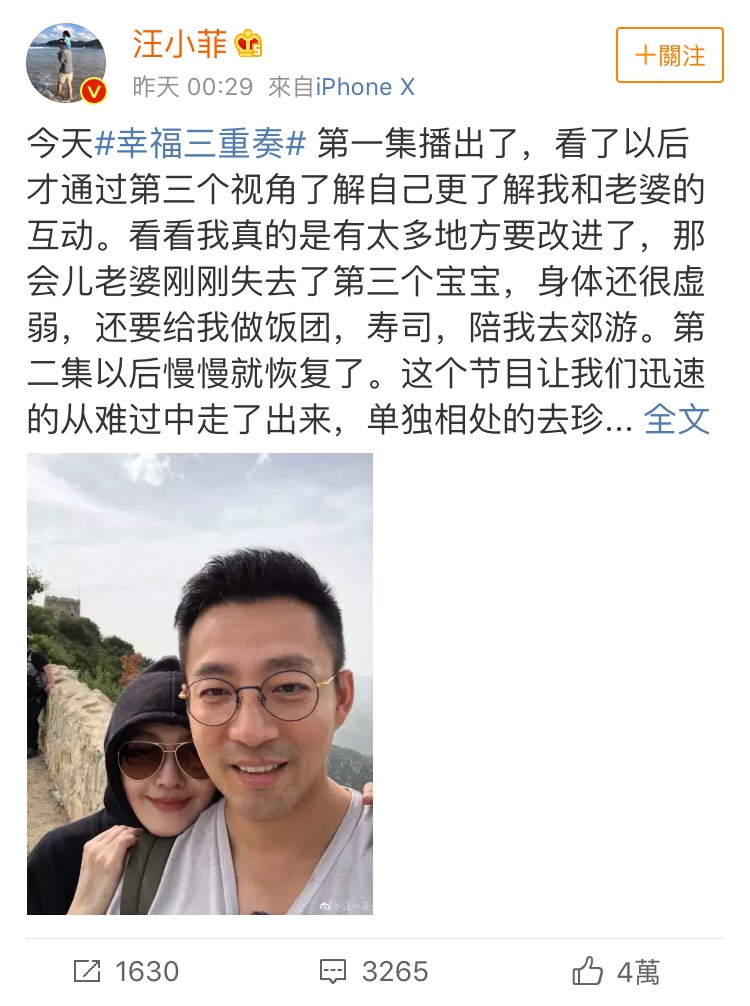 事後,汪小菲在自己微博評論下表示,其實透過節目拍攝,讓他更瞭解自己和大S的互動模式,直說還有很多地方需要改進,更感謝太太在剛失去寶寶,就打起精神陪他做了很多事。他也說,第2集之後,老婆就恢復精神許多,也坦言「節目讓我們迅速的從難過中走了出來,單獨相處的去珍惜彼此的獨處時間。做女人不易,做媽媽更不易,做一個北京直男的老婆更不易」,夫妻恩愛表露無疑,這番真情流露隨著節目熱播,也迅速地在網路發酵。