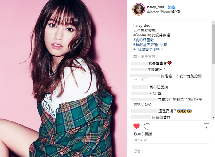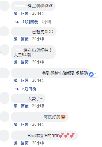 粉絲也在下方留言稱讚阿民:「好正啊啊啊啊」、「美到想輸出海報到處張貼」、「太美了~」、「阿民好美」、「R民妳超正的rrrrr」。阿民也有於IG分享另外一張雜誌照片,表示自己:「人生成就達成」,更說明拍攝當天只睡了四小時,還喝了三罐提神飲料,相當辛苦。