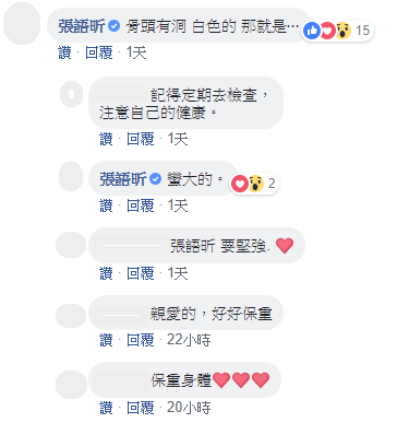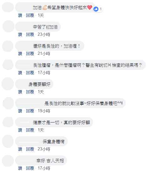最後她開玩笑:「你問我什麼癌?,喔對了我沒說,是吃貨癌,最惡性的那種,男友致死率99.999999的那種。」仍不改幽默作風。粉絲看到之後也心疼留言:「加油,希望身體快快好起來」、「還好是良性的,加油喔!」、「健康才是一切」,「真的要好好顧」、「保重身體唷」、「幸好 吉人天相」。