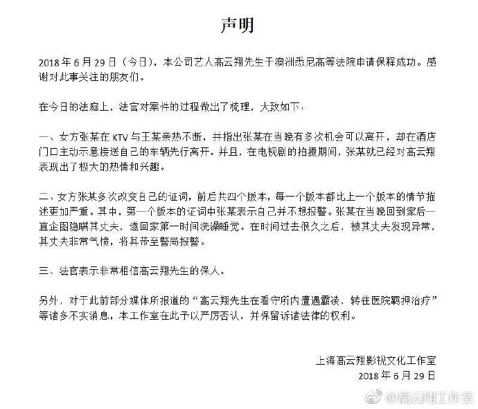 但也有一方說法認為高雲翔這次的事件是被陷害的,女子疑似和劇組方面費用談不攏,因此才會轉而告高雲翔性侵。而這次保釋成功也有可能是因為受害一方不斷改變證詞,高雲翔的工作室所提出的聲明大致要表達的就是認為女子的動機不單純,有可能高雲翔是被誣陷的。
