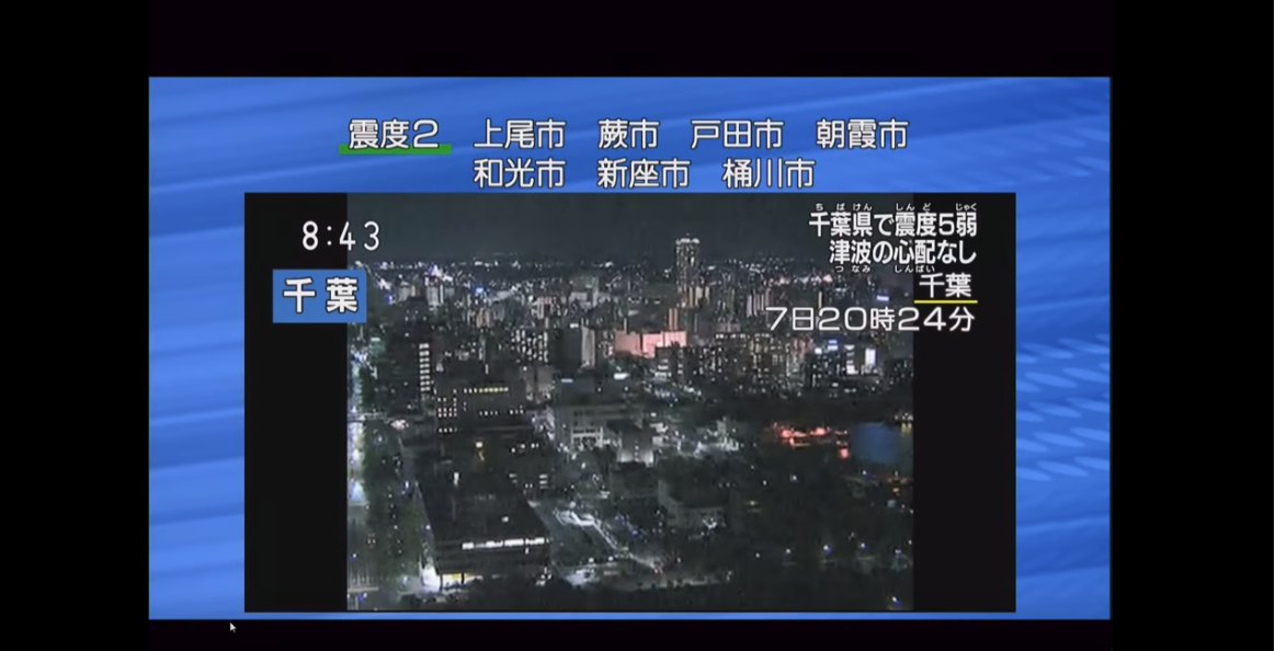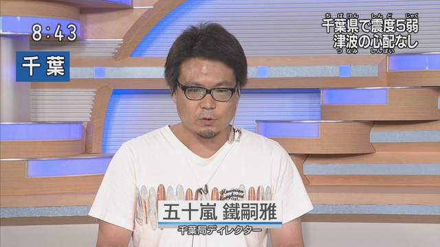 日本關東千葉縣當地時間7月7日20時23分(台灣時間19時23分),東面海域發生芮氏規模6.0、震源深度50公里強烈地震,東京地區以及周邊地區劇烈搖晃約10秒,暫無災情傳出,而日本氣象廳表示無海嘯威脅。除了地殼震動之外,受到外界關注的還有日本電視台NHK的地震播報員。當時地震發生時,NHK電視台播報新聞畫面上出現一位穿著著一件白色T恤、打扮隨意的男子,不嚴謹的裝扮讓網友以為電視台被恐怖份子給占領了。