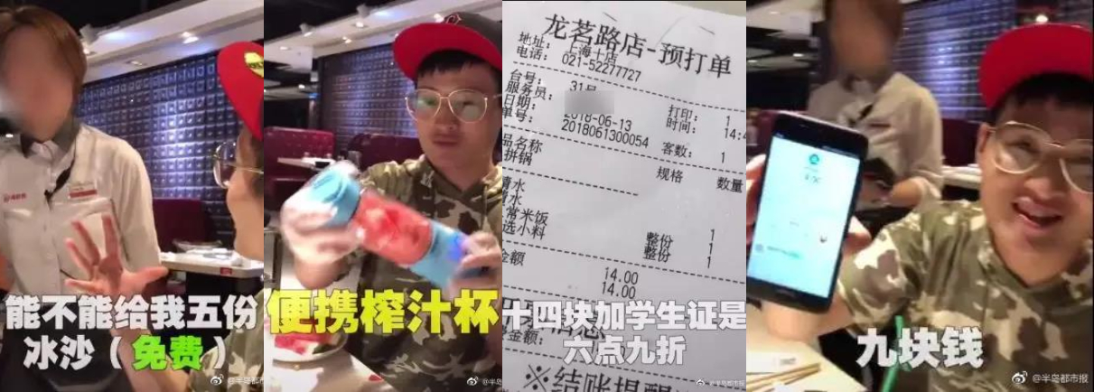視頻的開頭,superB太說要帶同事去吃甜品。一群人大概6、7個浩浩蕩蕩跑到上海一家海底撈並且強調了,是十塊錢吃甜點!接下來就是見證他們神操作的時刻:海底撈清水鍋底不收費,直接來了倆;調料十塊錢一位,6、7個人只要了一份;四塊錢一碗的白米飯也只要了一碗;免費的冰沙要了5份!然後他們就開始了一系列令人意想不到的操作:米飯直接下進了清水鍋裡做起了粥,等粥的功夫他們也沒閒著,幾個人竟然掏出了便攜式榨汁機,取了調料台上的免費瓜果,西瓜、黃瓜、番茄、甜瓜……加上之前要的免費冰沙,榨了西瓜汁、黃瓜汁、番茄汁、甜瓜汁……,這一波兒操作下來他們僅僅花了調料10塊錢+米飯4塊錢=14塊錢。你以為這就結束了?並!沒!有!他們買單時,拿出了學生證,於是又在14塊錢的基礎上打了6.9折,所以一共只花了9塊錢(約台幣45元)!視頻的結尾,他們還配上這樣一句話:10元下午茶,你們get到了嗎?
