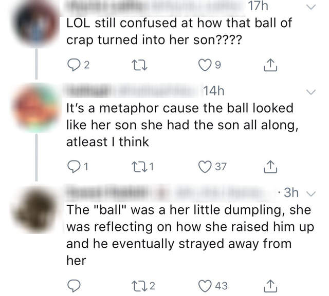 不少華人網友跳出來回應「這是個隱喻,因為那個球看起來像她兒子,而她兒子一直都是她的,至少我是這麼想的」、「那個"球"是他的小包子,她是在回想她是怎麼養大他,然後他就離她而去」、「當其他人覺得皮克斯短片《包子》很奇怪又讓人看不懂,完全說不通的時候.....我在結局時哭了,因為我非常能夠理解,真的很高興在螢幕上終於看到能夠代表我的東西」、「我對《包子》帶來的困惑的看法:當你終於有一部對不被重視的族群來說非常有意義的電影,然後某些人覺得那一點都不重要......亞裔美國人表示:我讓你覺得很困惑嗎?」、「皮克斯之前的短片讓我真的很想回家擁抱媽媽」。