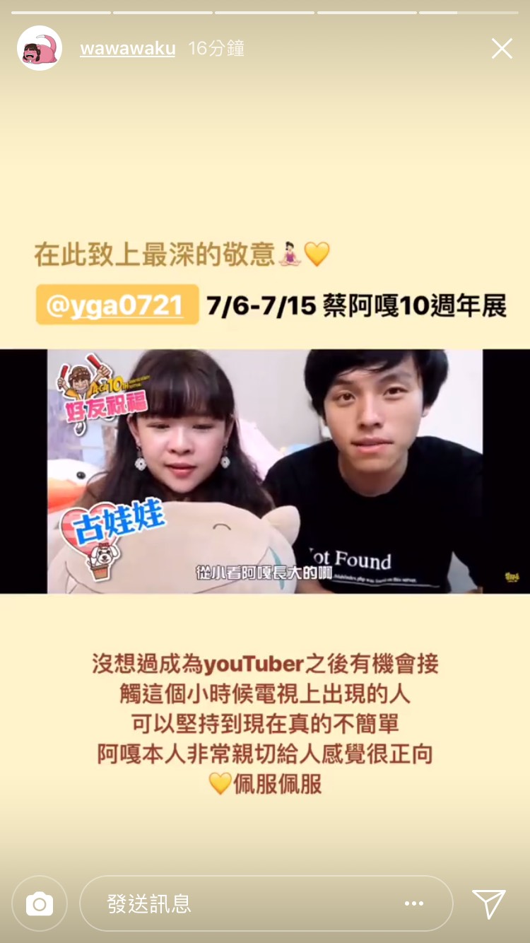 而古娃娃之後也在IG限時動態再次跟蔡阿嘎表示敬意,表示自己真的很佩服阿嘎:「沒想過成為Youtuber之後有機會可以接觸這個小時候出現在電視上的人,可以堅持到現在真的不簡單」,她也稱讚阿嘎「阿嘎本人非常親切,給人感覺很正向」展現了youtuber之間惺惺相惜的心情,也希望之後古娃娃也可以辦10年紀念展覽!