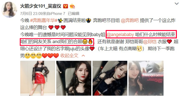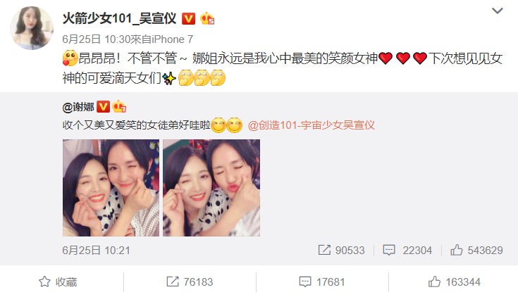 許靖韻的粉絲是典型的“酸葡萄”心理,要是許靖韻看到吳宣儀發的微博,她肯定會很羡慕!《創造101》的冠軍孟美岐可以和何炅牽手,亞軍吳宣儀可以拜謝娜為師,吳宣儀還可以和angelababy親密互動。