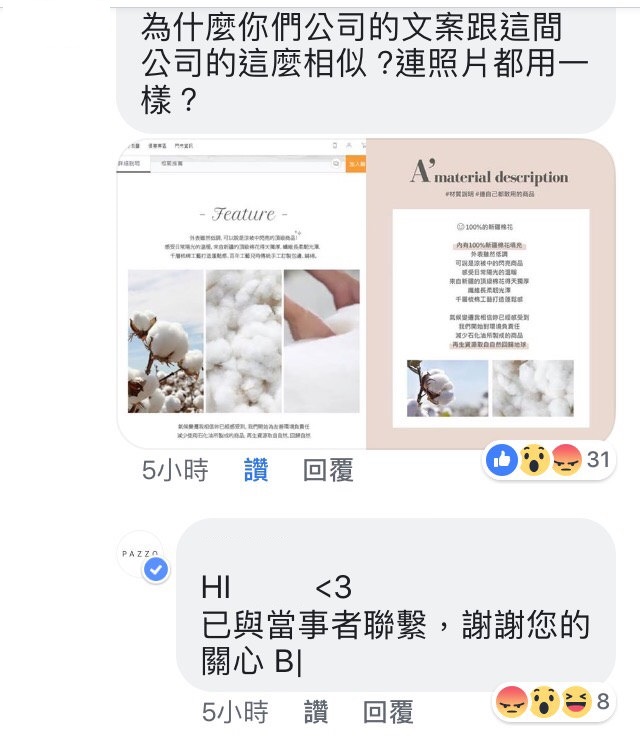 原來PAZZO近日推出新的居家商品,文案卻與翔仔居家極度相似,網友立刻在下方留言處提出質疑:「為什麼你們公司的文案跟這間公司的那麼相似?連照片都用一樣?」只見文案的第一段除了排版之外幾乎一模一樣,就連棉花圖片也相似度非常高,抄襲顯而易見。
