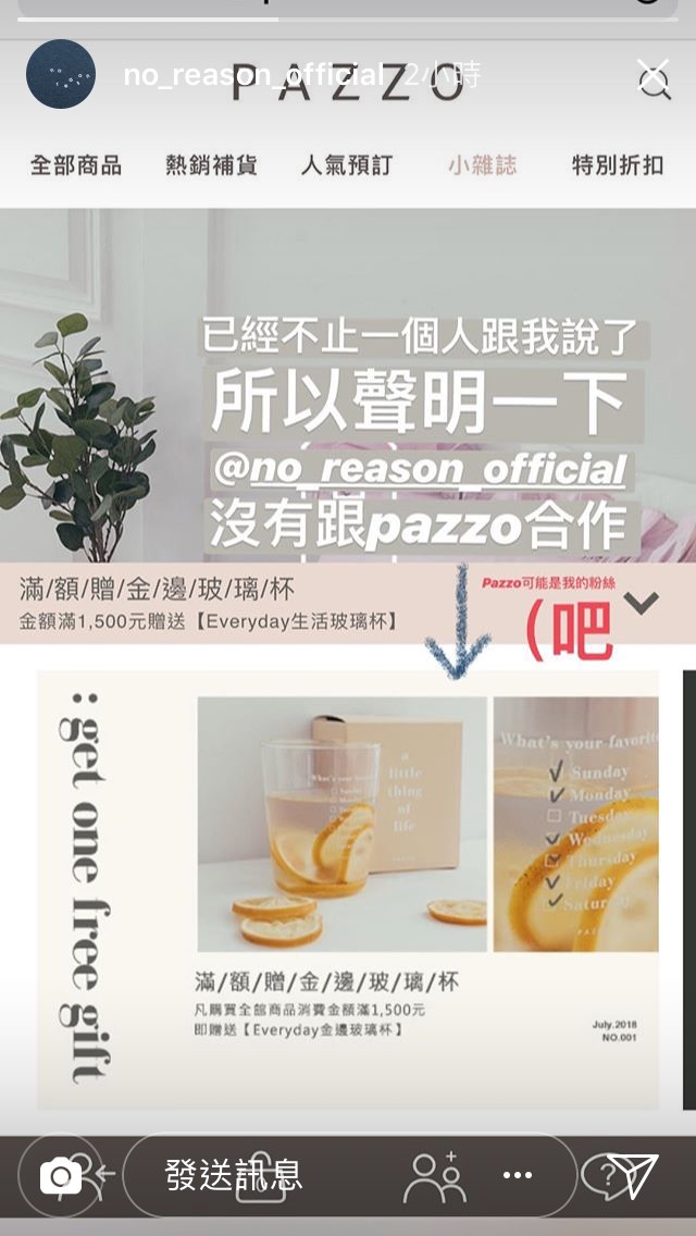 據了解pazzo的滿額贈品「金邊玻璃杯」與另一家網拍「no_reason_official」的商品非常相似,也讓「no_reason_official」透過IG限時聲明並沒有和pazzo合作,昨更表示已經與pazzo反應,卻被否認:「並無參考特定品牌的商品」,「no_reason_official」也無奈表示:「留給大家自行判斷我好累」,也表示對於pazzo的抄襲事件「覺得很難過甚至是丟臉」。