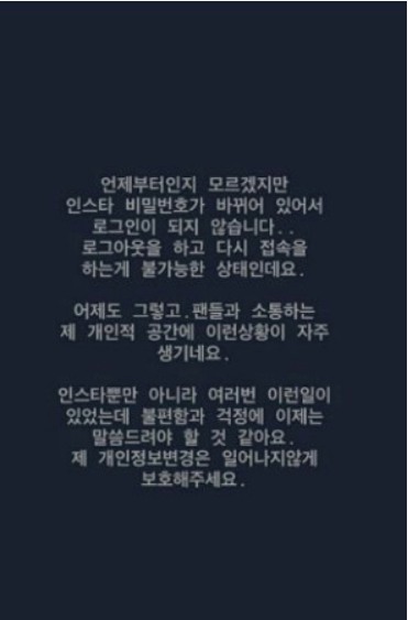 潤娥8日透過Instagram的限時動態說:「不知道是從何開始,我的密碼就一直被改,而且不能登入,登出後再試著登入,(IG)就不能用了。」原來是她7日在泰國見面會,原安排要利用Instagram直播,但該環節因為她的帳號被盜失敗,她難過地表示:「昨天(7日)也是這樣,我與粉絲溝通的個人空間,卻常常發生這樣的狀況。」並呼籲外界:「請別再讓我的個人訊息變更的事情發生。」