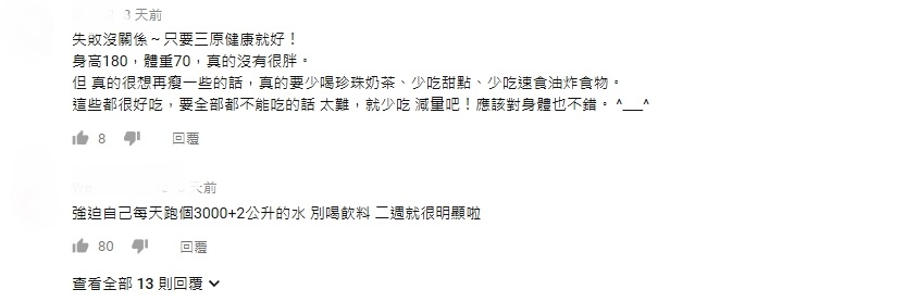 影片發布後也有許多網友貼心提醒,健康的飲食搭配運動才是瘦身的不變法則。