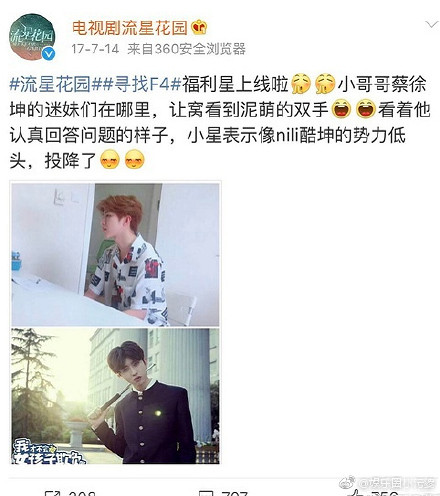 大陸新版《流星花園》9日在大陸湖南衛視開播,從主角、配角到劇情台詞都掀起網友討論,雖然慘遭頻頻吐槽,但證明真的很多人在關注這部改編經典的作品。在這波討論熱潮裡,有網友翻出新《流星花園》中的「青和」一角原本的人選之一,竟然是因《偶像練習生》爆紅的蔡徐坤。