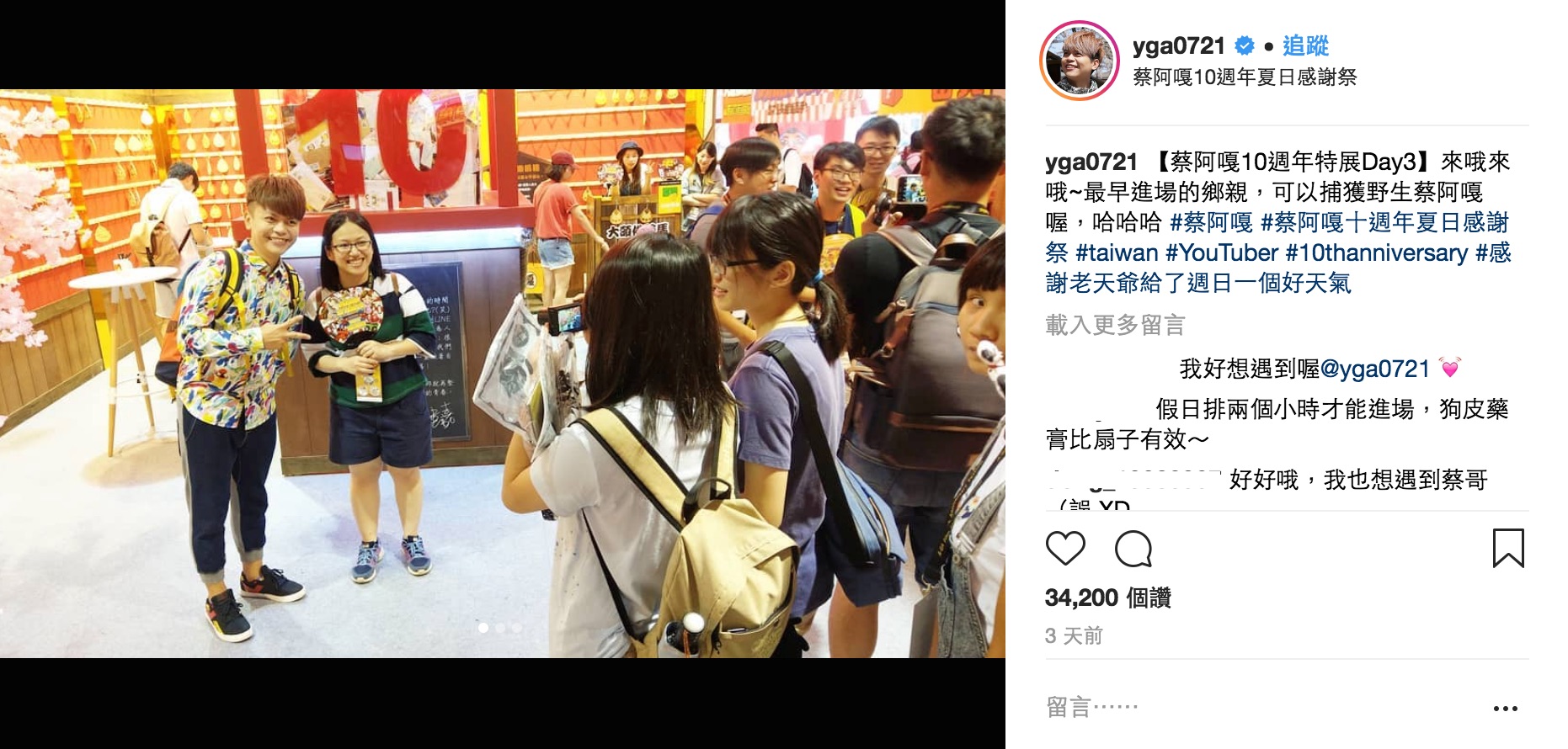 百萬網紅「蔡阿嘎」無厘頭又貼合時事的影片內容,深受網友喜愛,帶著有點台味的腔調,搞笑又不計形象,蔡阿嘎在YouTube頻道就擁有近175萬訂閱,另外與老婆嘎嫂「二伯」的互動也受到矚目。日前就因擔任YouTuber滿十年,7月在華山文創中心舉辦10周年特展,也有眼尖網友發現門票優待票的門檻根本超佛心!