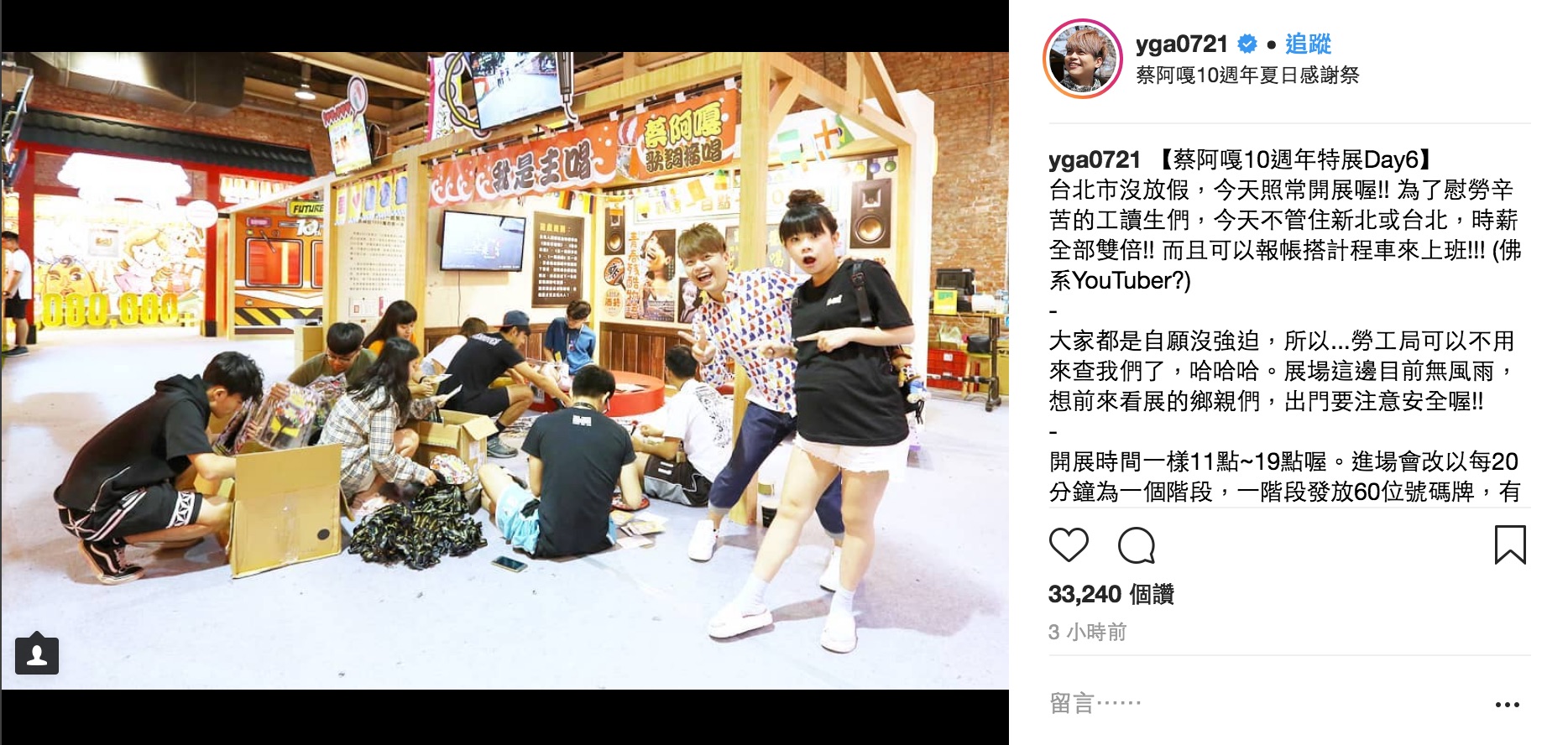 也有眼尖的網友發現在售票的網站中,優待票的門檻根本超佛心,一般都是要軍公教或學生才有,但這次只要與蔡阿嘎有關的不管是念過同一個學校或是姓氏有關等等,都能省50元,真的是從小細節都能看到他的用心,也讓網友直呼蔡阿嘎根本最用心最親民的YouTuber。之前也因天氣太熱體恤粉絲排隊看展的辛勞,親自買飲料慰問,在11日颱風天連新北市都停班停課的日子,蔡阿嘎也po出讓展場工讀生時薪雙倍,還可以搭計程車報帳,根本佛系YouTuber!